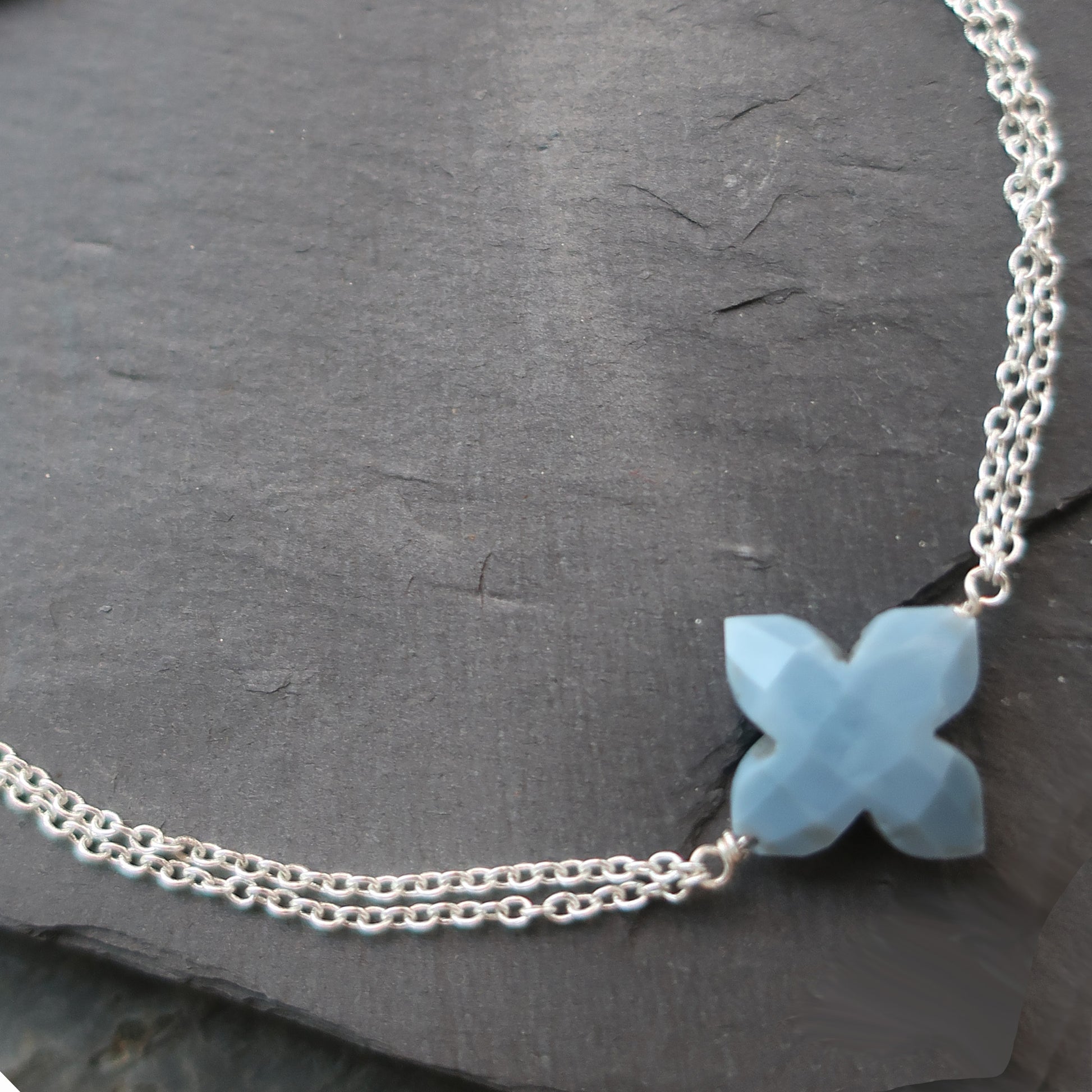Indulge in pure luxury with our Blue Opal Wildflower Bracelet. The mesmerizing blue opal symbolizes a harmonious balance between the earthly and spiritual realms. Crafted with exquisite detail, the four-petal design represents this equilibrium, while the wildflower centerpiece adds a touch of whimsy. Finished with double chains, this bracelet is a must-have for the fashion-forward and spiritually attuned.