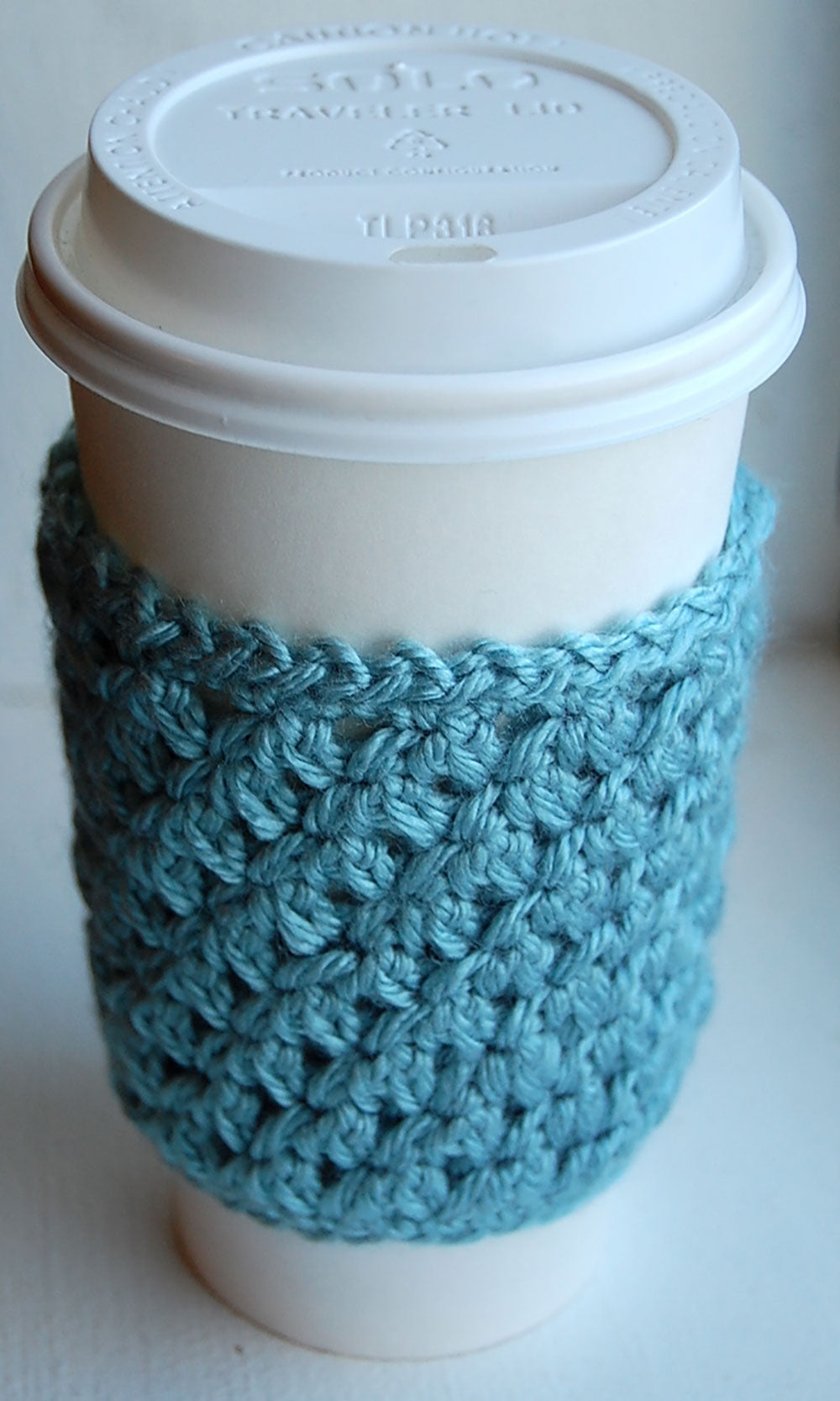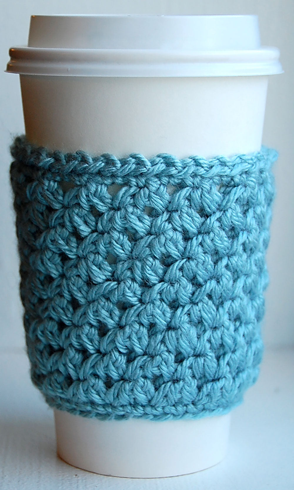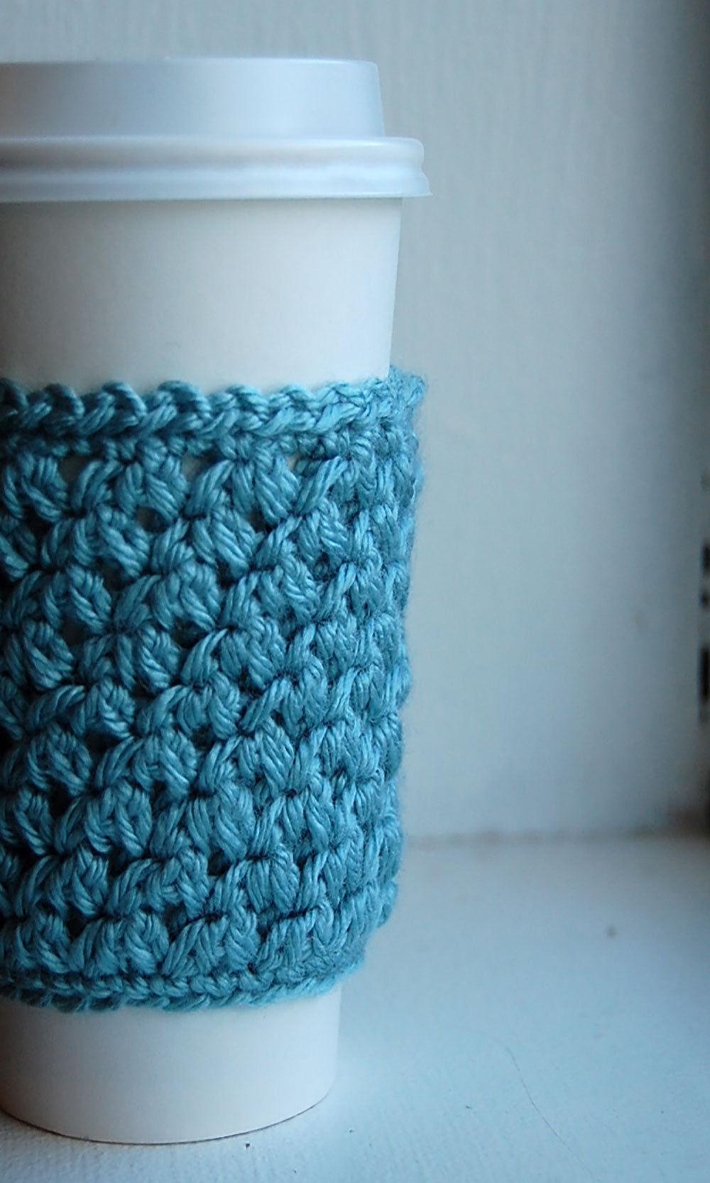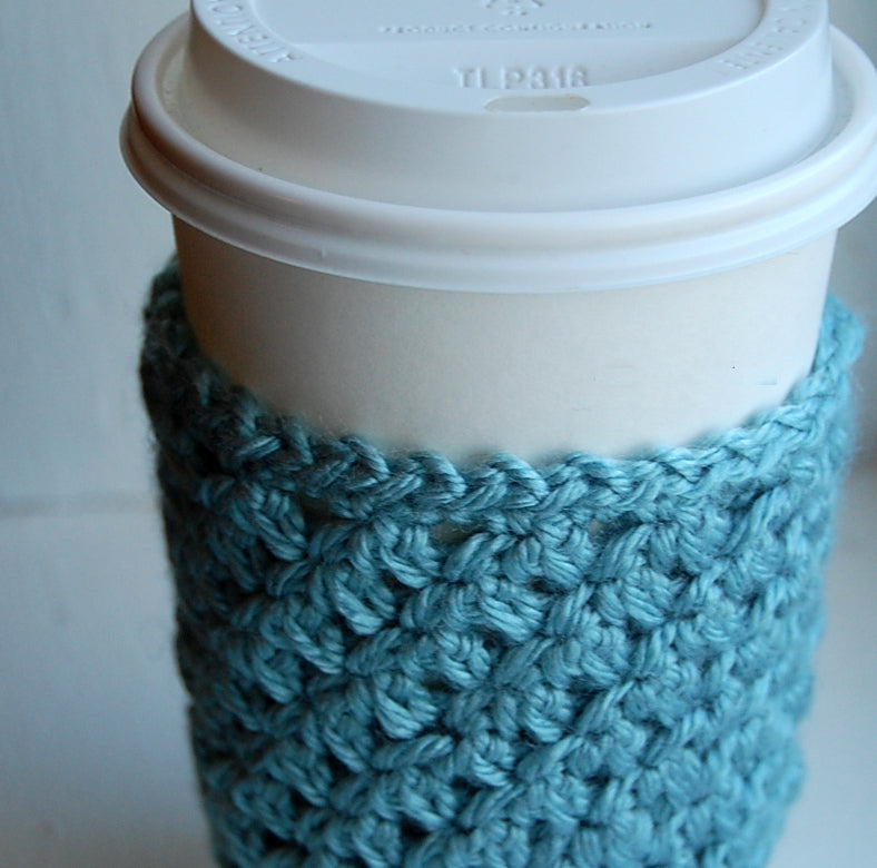 This unique sleeve is my stitch design for those of you who like a more solid look to your cup sleeves. I created this with an acrylic yarn in a fun aqua blue color. It's stretchy enough to fit all sizes of coffee cups to go. Machine wash. Cold water only.