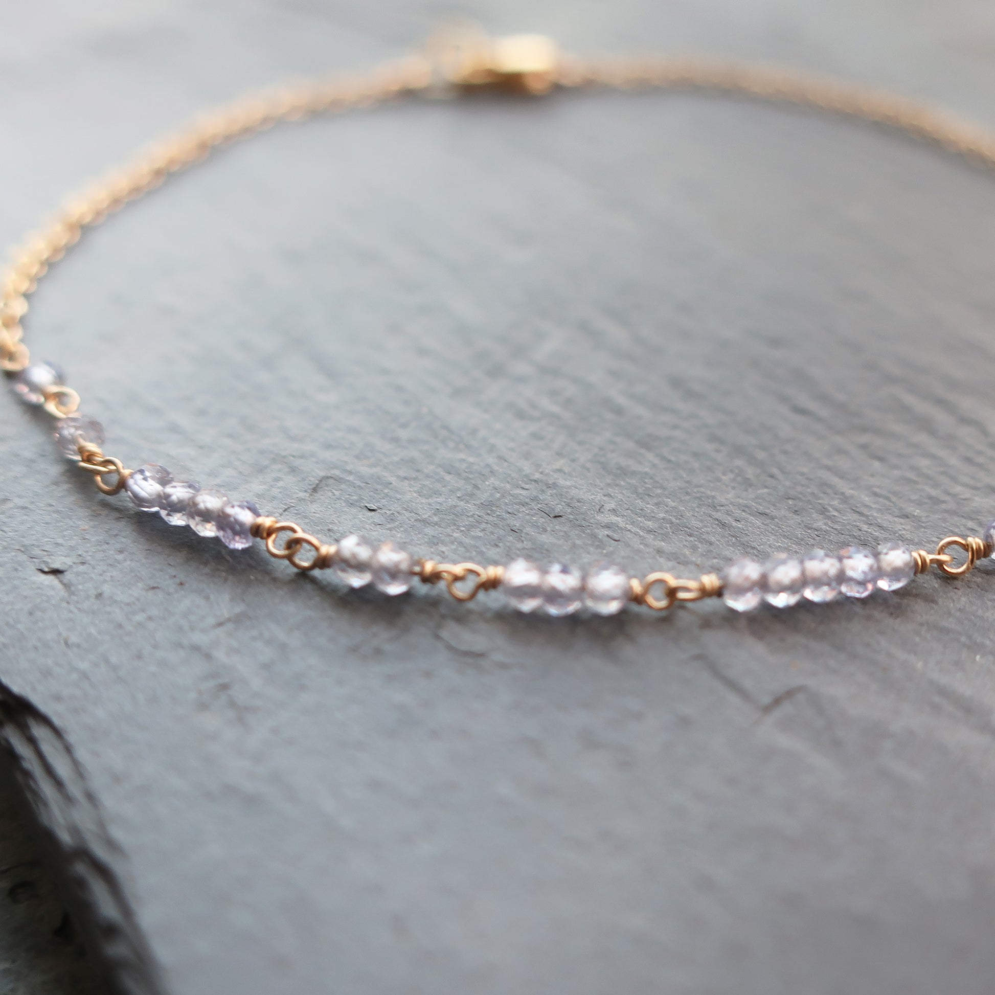 Adorned with brilliant light purple tanzanite stones and 14K Gold Filled (or sterling silver) chain, Divina is a simply dainty and divine bracelet perfect for layering or making a statement all its own.