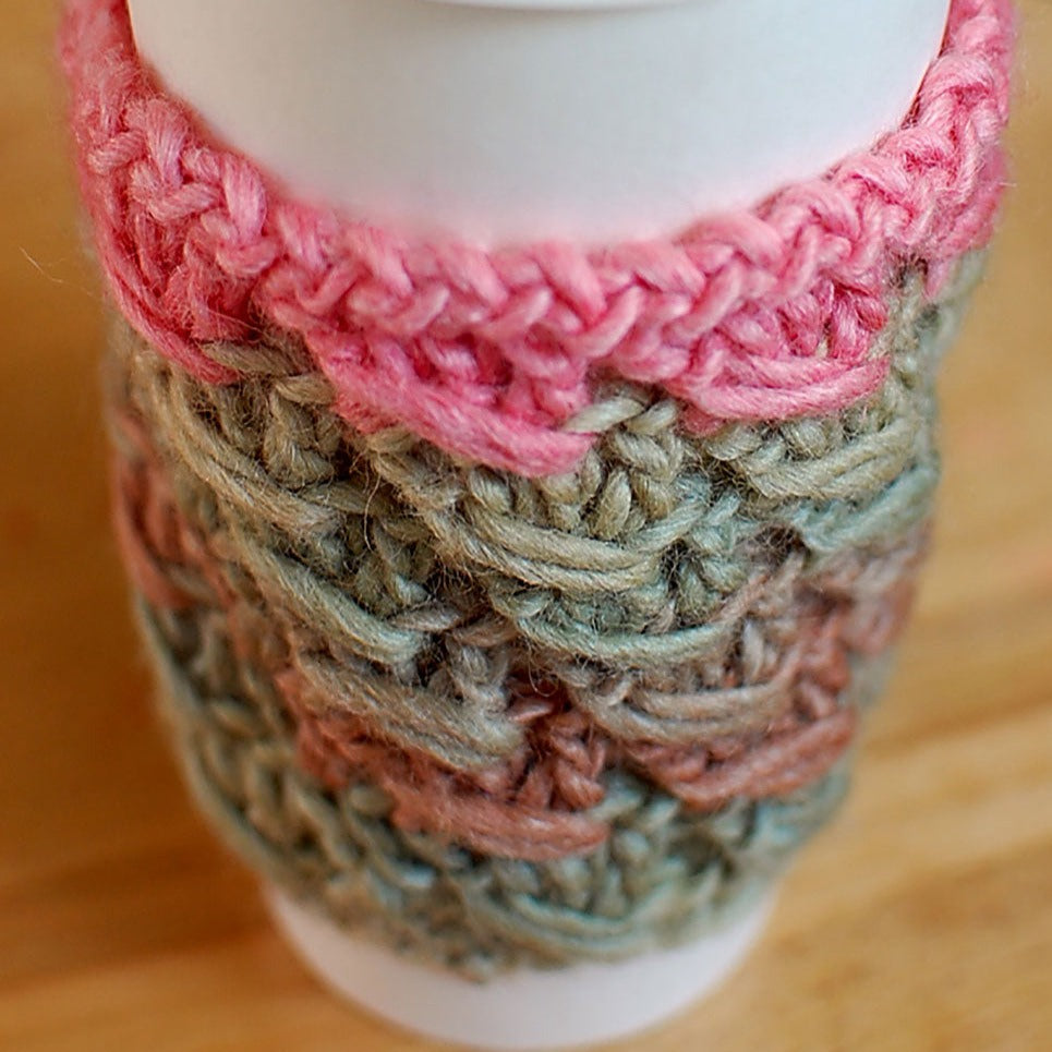 Due to the nature of the yarn used, this Coffee-a-go-go sleeve is truly unique and cannot be duplicated exactly.