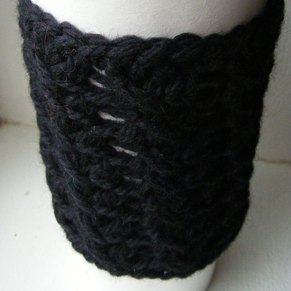 Created with 100% wool yarn in jet black just like plain black coffee. Its design creates a unique grip that's thick enough to keep your coffee warm and your fingers from getting burned. It is also stretchy enough to fit all sizes of coffee cups to go. Hand wash only.