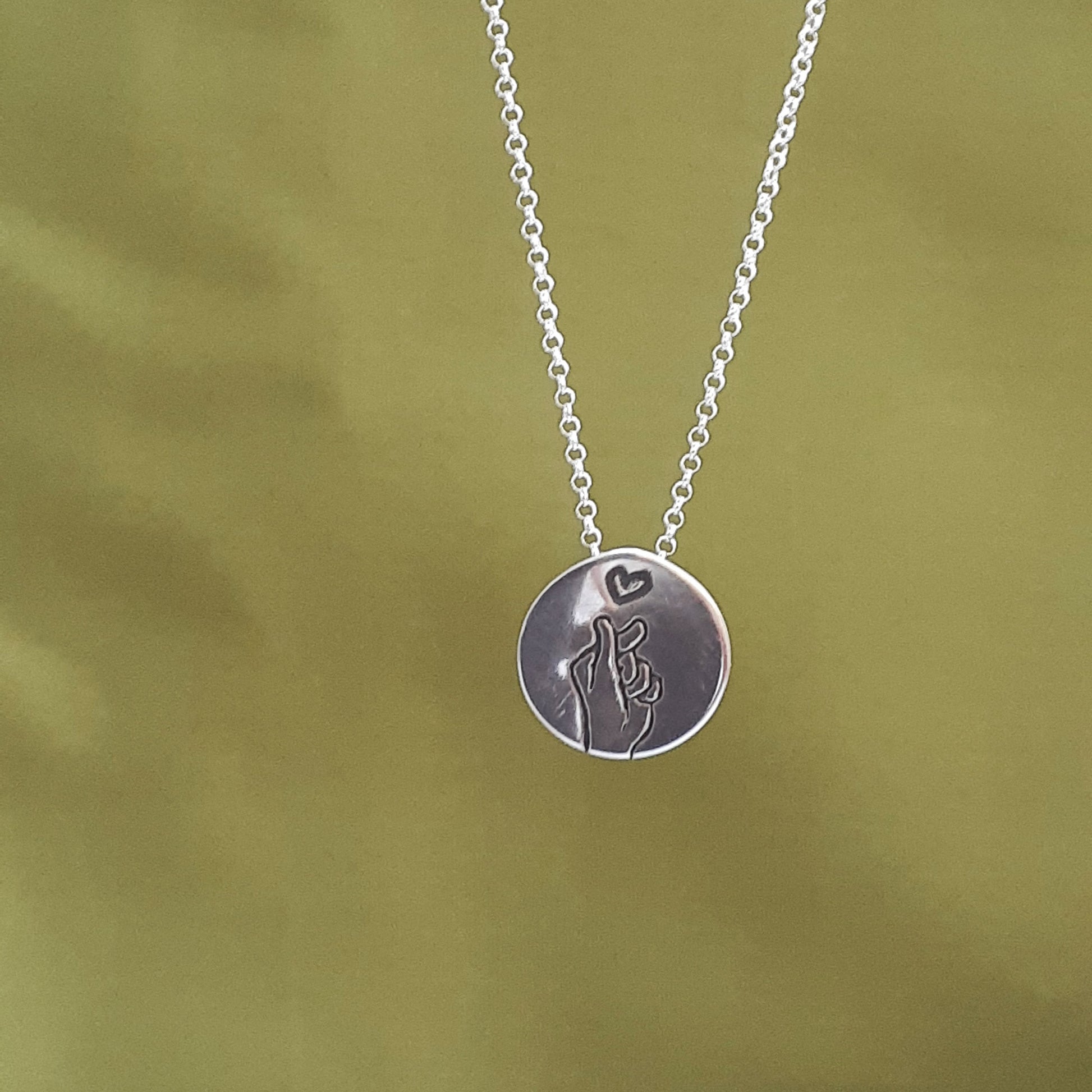 This piece features a uniquely hand-drawn jiji + jo creation (all rights reserved). The image is stamped onto a small sterling silver disc and the bail is soldered to the back of the charm to give full focus on the design.