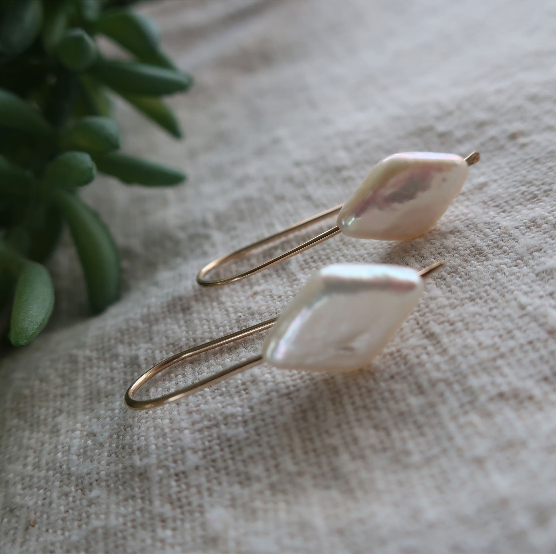 Cultured into an elegant diamond shape and paired with gracefully curved earwires, these pearls are dramatically different, but yet so fun. Crafted and hammered by hand with 14k goldfill or sterling silver wire.