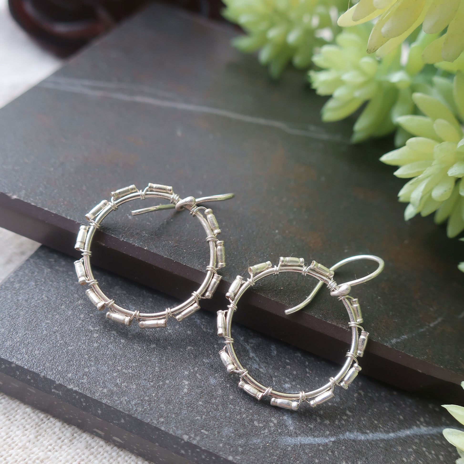 Sterling silver beads in the shape of tiny little ‘handles’ are carefully wire wrapped around small hoops to create these uniquely shaped pair of earrings. A bit tribal, but yet modern at the same time.