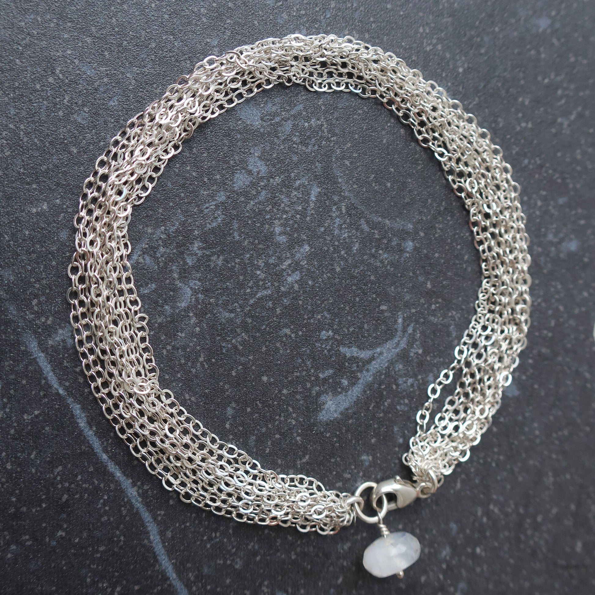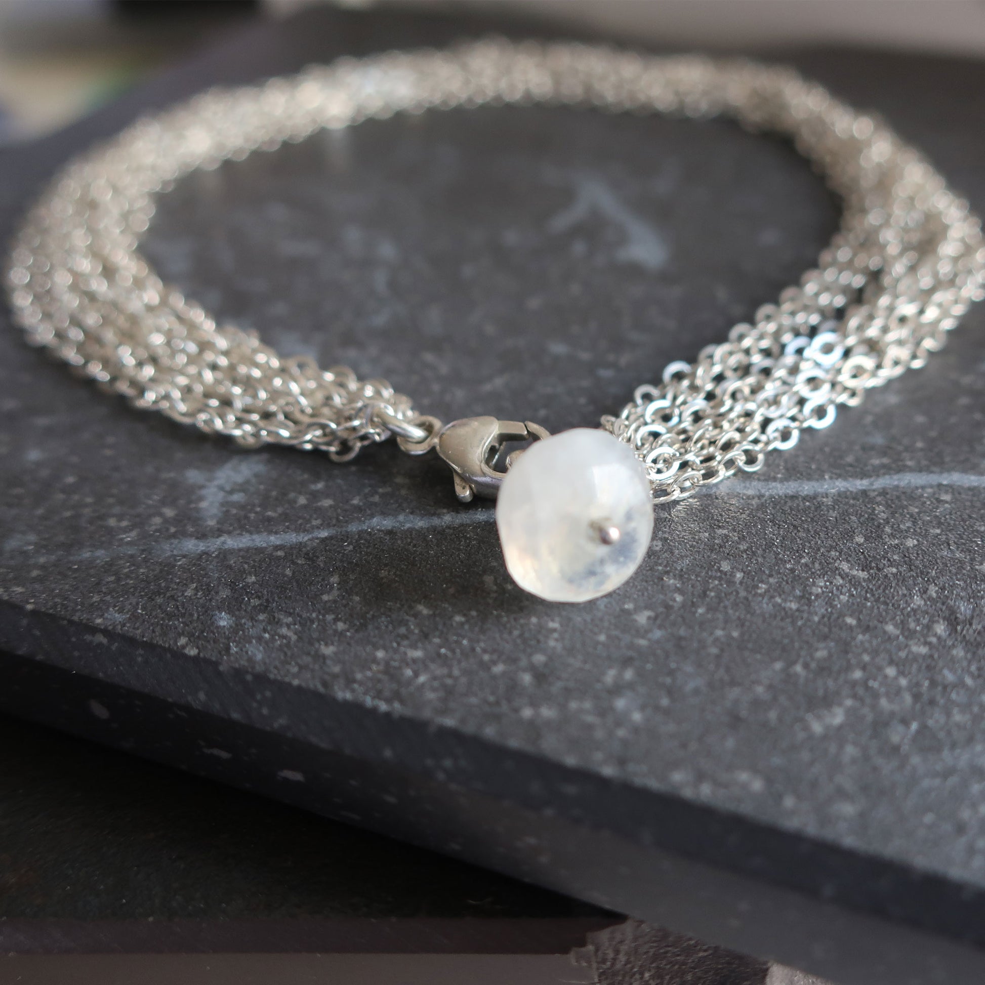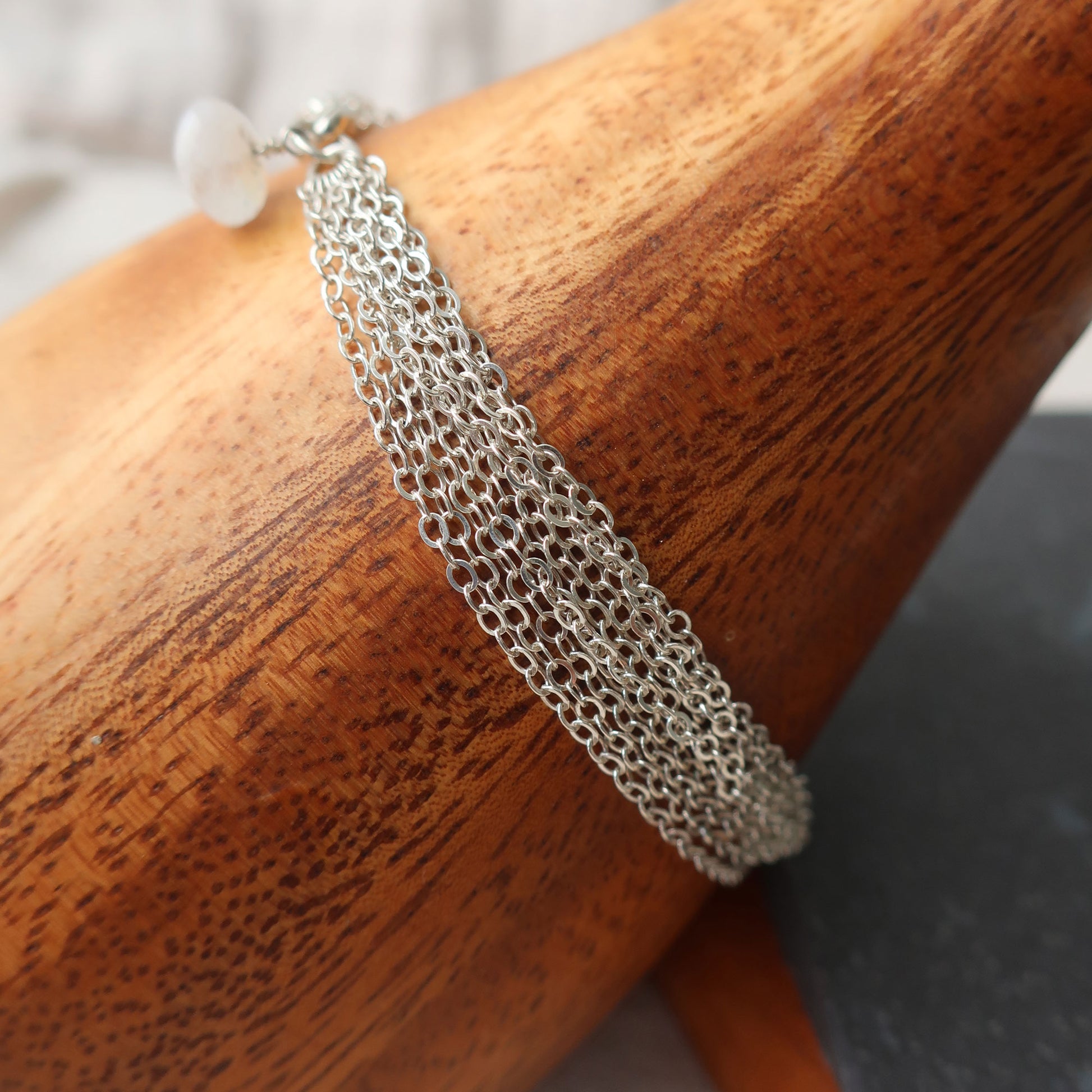Surprisingly light and flowing, this modern chain bracelet is a must have! Layers of sterling silver cable chain cascade towards a single large moonstone rondelle.
