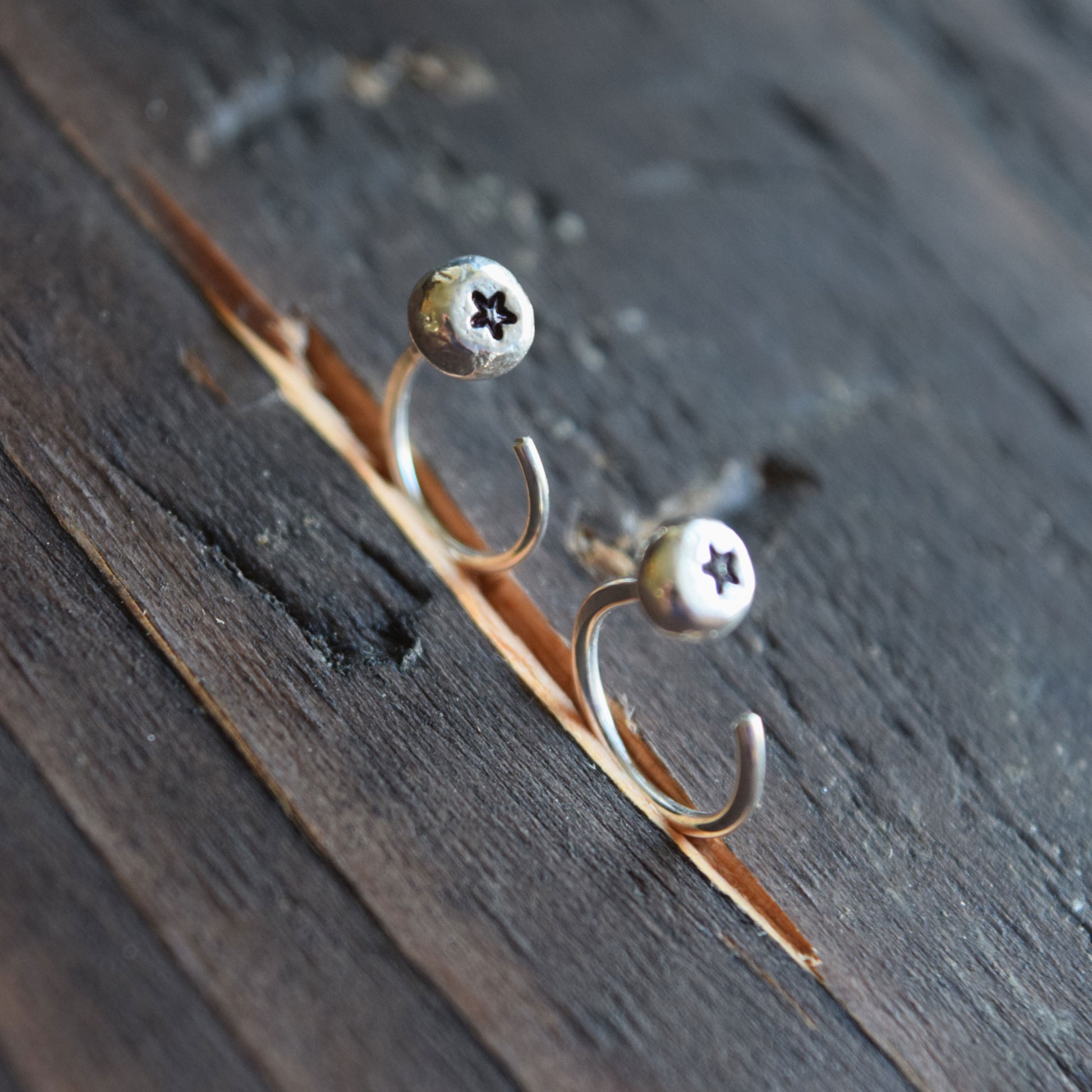 These earrings are made with recycled sterling silver, handstamped with a tiny star, and accented and polished to a super bright sheen. They're a perfect size for an upper lobe piercing, but can be used in a standard lobe piercing.